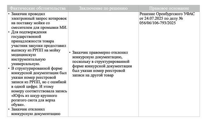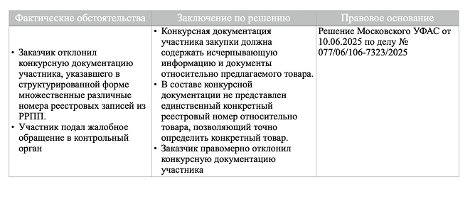 Участник не разобрался с реестровыми номерами и указал множественные реестровые номера на единичный товар. В данном случае заказчик отклонит конкурсную документацию, и контрольный орган поддержит заказчика.