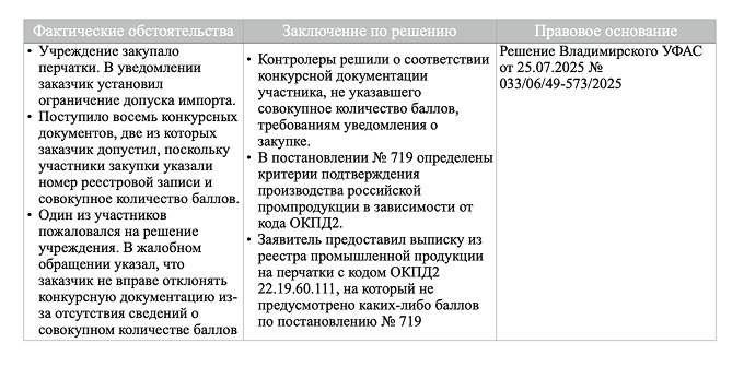 Заказчики не ограничиваются формальным анализом конкурсной документации и проверяют самостоятельно государственную принадлежность товара. Ознакомьтесь с примером проверки заказчиком данных в реестре и правомерного отклонения конкурсной документации участника, у которого не хватало баллов по постановлению № 719.