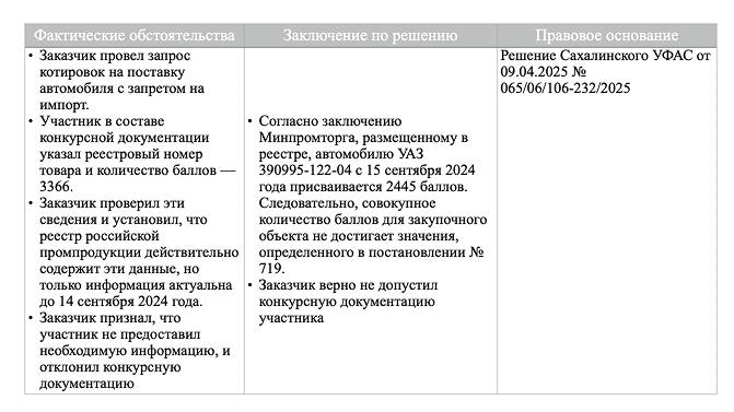 Если участник в своей конкурсной документации указал номер реестровой записи, но не отметил совокупное количество баллов, это не основание отклонять конкурсную документацию при условии наличия в реестре необходимых сведений (подп. «а» п. 3 постановления № 1875, письма Минпромторга от 13.05.2025 № 52580/12, от 15.05.2025 № 53728/12, ФАС от 03.06.2025 № 28/51603/25).